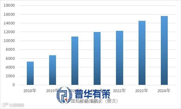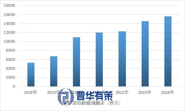 中国船舶修理市场展现出强劲增长势头,受益于全球贸易繁荣、海上运输需求增加以及中国船舶制造业的快速发展,吸引了大量国内外订单。2018年中国船舶修理艘次为5256.02艘次,2024年增长至15600.8艘次,年复合增长率达19.88%。