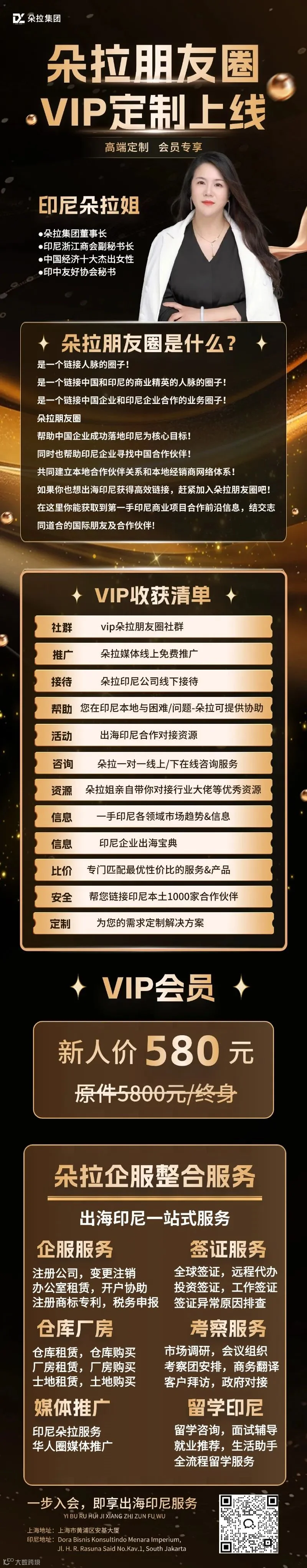 上海朵啦商务服务有限公司(简称朵拉企服)自2019年成立以来,作为国内人力资源专业领域出身的服务供应商,我们已经带领众多中国品牌企业开拓海外市场,落地东南亚。公司力争立足印度尼西亚,辐射东南亚,推动科技赋能,提升企业管理品质。相继在中国上海和印尼首都雅加达开设了公司,搭建中、印、英语等高端人才的本地化服务团队,为出海企业提供全程顾问式管家服务,以成为东南亚出海企业首选一站式服务平台。