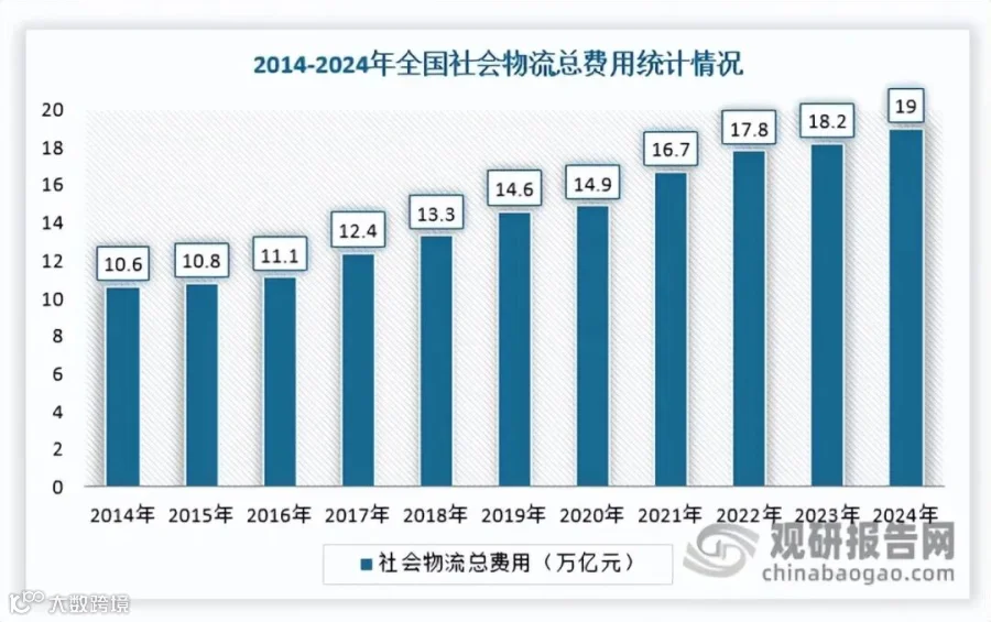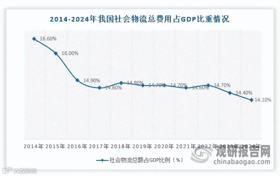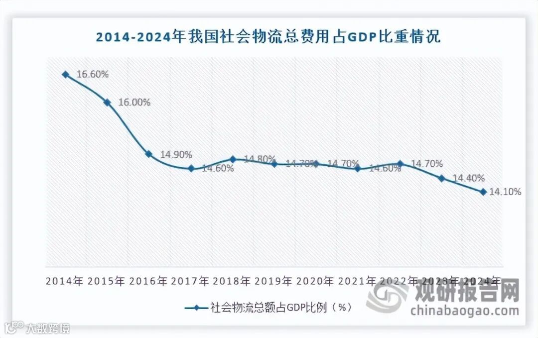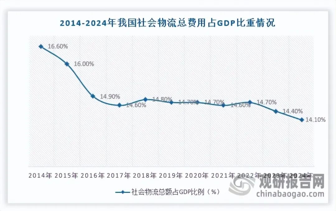 与物流需求扩张相伴,我国社会物流总费用(含运输、保管与管理费)规模亦显著攀升,从2012年的9.4万亿元增至2024年的19.0万亿元。然而,衡量一国物流体系效能的关键指标——社会物流总费用占GDP的比重,却呈现相反的走向,从2012年的19.0%稳步降至2024年的14.1%。这一降序轨迹清晰表明,在业务总量放大的同时,我国物流行业的整体运行效率得到了实质性优化,发展质量持续提升。未来,随着现代化信息技术的进一步应用和物流行业专业化、集中化水平日趋提高,我国物流行业将有更大的发展空间。