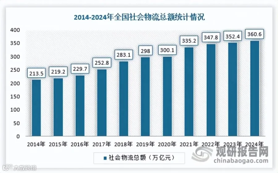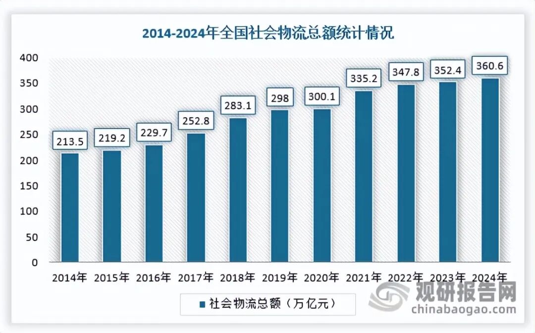 我国作为全球供应链枢纽与拥有庞大内需的市场,其物流业的扩张根植于深刻的宏观背景。一方面,国际产业资本的持续投入与国内消费升级浪潮,共同奠定了庞大的实物物流需求基础。另一方面,在“国内国际双循环”战略指引下,商品流通效率被提升至新高度。多重动力驱动下,我国物流行业实现了跨越式增长。根据据中国物流与采购联合会数据,全国社会物流总额从2012年的177.3万亿元迅猛增长至2024年的360.6万亿元,实现了规模的倍增。