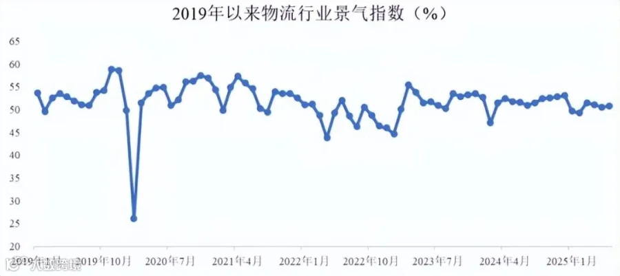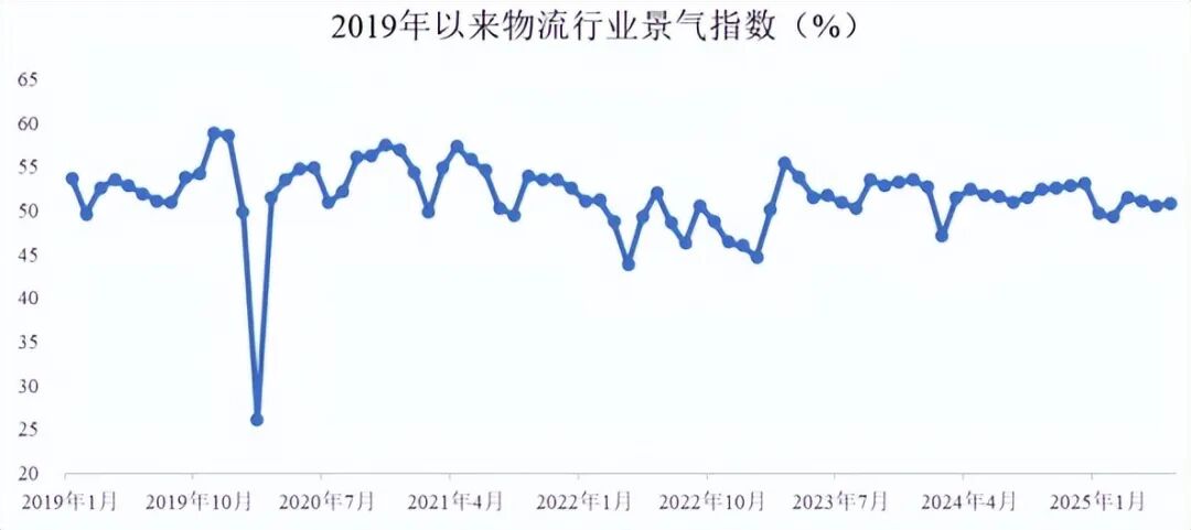 物流业景气指数反映物流业经济发展的总体变化情况,以50%作为经济强弱分界点,高于50%时,反映物流业经济扩张;低于50%,则反映物流业经济收缩。根据中国物流与采购联合会数据,如下图所示,2019年1月至2025年6月我国物流业景气指数(LPI)除2020年1-2月、2022年3-4月、2022年下半年、2023年1月、2024年2月及2025年1-2月指数相对较低,其他时间内物流业基本处于扩张区间,反映出我国物流业总体仍处在平稳较快的发展周期。