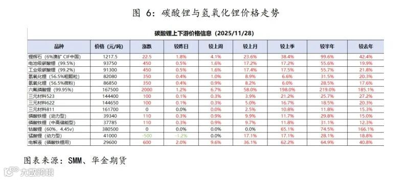 上游矿端:澳洲SC6锂辉石精矿报价升至1217美元/吨,月涨24%;巴西及非洲锂辉石同步大涨;锂云母(Li₂O)精矿涨至2600元/吨,月涨19.3%。
