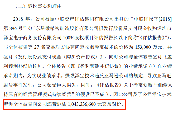 对星徽股份,这无疑是巨大的打击。为此,星徽股份起诉泽宝原股东,要求对方返还交易对价约10亿元(最终为9.5亿元)。因为原团队的违规刷单行为,让泽宝技术在收购前就埋下了“惊天巨雷”,若按照此前提进行价值估算,当初敲定的15亿多收购价显然不合实际。但目前,该案一审判决,法院驳回了诉求。星徽股份表示将继续上诉。