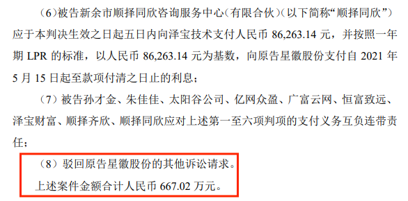 于是,泽宝原股东起诉星徽股份,要求对方兑现奖励金,并支付案件受理费合计2680.10万元。目前,该案一审被法院驳回诉求,终审裁定星徽方面支付业绩奖励本息合计2797.68万元。