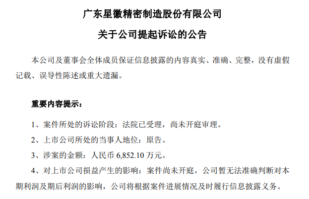 据星徽股份最新公告,其已向深圳中级人民法院提起诉讼,要求泽宝技术原股东孙才金等9名被告,就泽宝技术子公司Sunvalleytek International Inc、Sunvalley(HK)Limited,自2016年度起,欠缴的税款、利息、罚金,赔偿星徽股份总计6852.10万元。目前这起诉讼已被受理,尚未开庭。