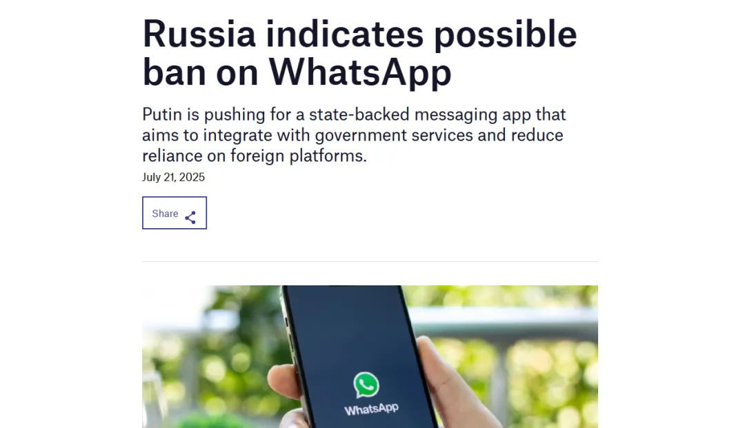 最新消息,俄罗斯宣布将于 9 月 1 日起在全国范围内禁用 WhatsApp,同时由 VK 公司开发、政府支持的国产应用 “Max” 将同步预装在所有新售设备中。