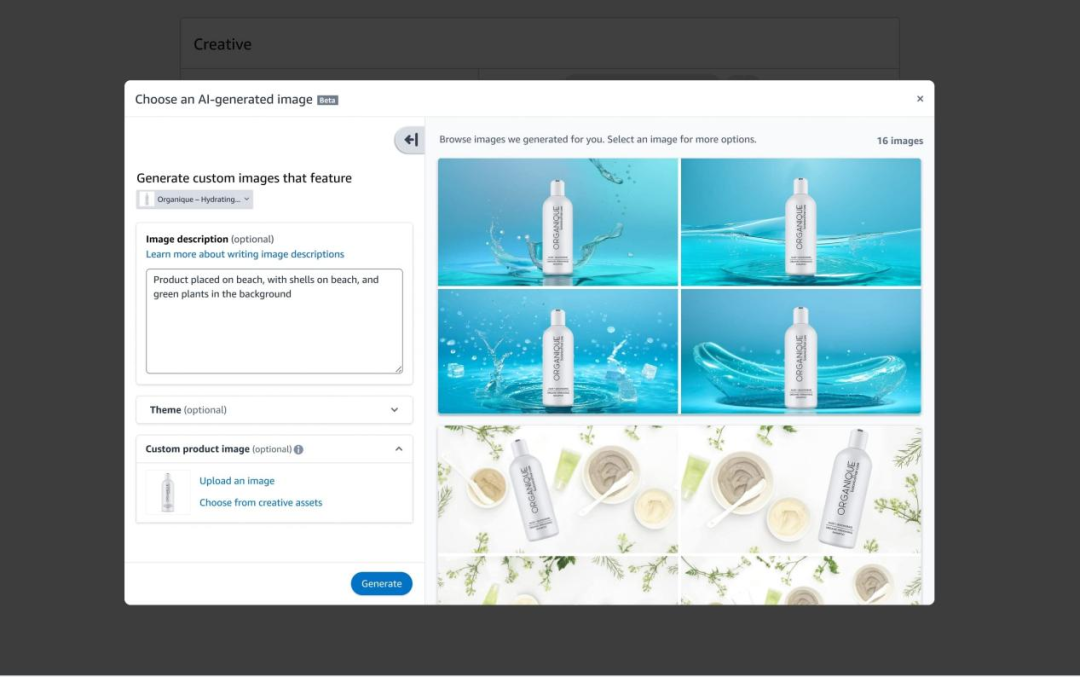 去年,亚马逊就针对美国赞助商品牌活动推出了测试版AI图片生成功能。卖家可通过输入指令,让AI生成契合品牌主题的产品图片。如果用户不满意AI生成的背景效果,卖家也可从自有图库或创意图库中挑选合适的图片作为背景,让AI完成加工。