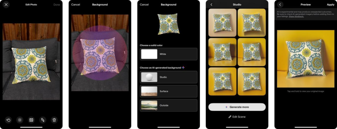 类似地,eBay也有一项AI背景增强功能。该功能旨在根据产品的不同特性,将产品图原有背景替换成专业级的视觉效果,智能匹配各种真实使用场景,以此拉高产品图质感,促进销量增长。