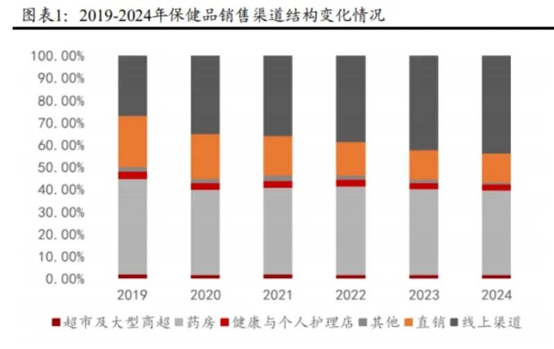 保健品行业渠道历经变换,疫情后行业渠道线上化转型加速,线上渠道成为主流赛道。我国保健品销售 渠道经历了直销、药房、电商三个不同的发展阶段:①直销渠道。2008 年以前我国保健品行业主要销 售渠道为直销,当时以安利为代表的外资品牌以人海战略的直销模式迅速占据市场。②药房渠道。 2008 年后,因保健品直销牌照的缩紧,药房成了保健品行业新一轮的主要销售渠道。③电商渠道。到 2019-2020 年,随着医保制度的改革,保健品被明确禁刷医保卡,恰逢疫情期间电商渠道的爆火,保健 品行业的线上电商销售比例快速增长,电商渠道成为新一轮保健品行业主要销售渠道。据 Datayes 数据 统计,保健品电商渠道销售占比从 2019 年的 27.3%逐年上升至 2024 年的 43.9%,累计上升 16.6pcts, 而直销渠道销售占比则从 2019 年的 22.9%下降至 2024 年的 13.0%,累计下降 9.90pcts,药房渠道销 售占比则从 2019 年的 42.7%下降至 2024 年的 38.0%,累计下降 4.70pcts。渠道变革不仅改变了产品 触达方式,更重塑了品牌竞争格局,为新锐品牌弯道超车创造了历史性机遇。