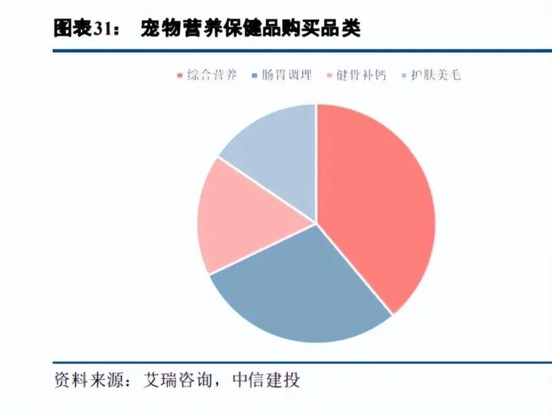 此外,宠物保健品让养宠人成为保健品消费新群体。据飞瓜数据显示,2024 年抖音宠物行业整体 GMV 同比增幅达 50%,其中猫/狗保健品以 225%同比增幅的亮眼表现,成为年度增速最快的明星细分赛道。 根据艾瑞咨询数据,2019-2022 年肠胃调理宠物保健品的线上复合增速达到 62%,健骨补钙宠物保健品 的增速也超过 50%。在宠物营养保健品中,综合营养品是主力消费品类,38.9%的宠物主会给自己的宠 物购买综合营养品,其次是肠胃调理类产品,近 30%的宠物主在饲养过程中会给宠物购买肠胃调理类产 品;健骨补钙和护肤美毛产品的购买比例也都达到 15%以上。