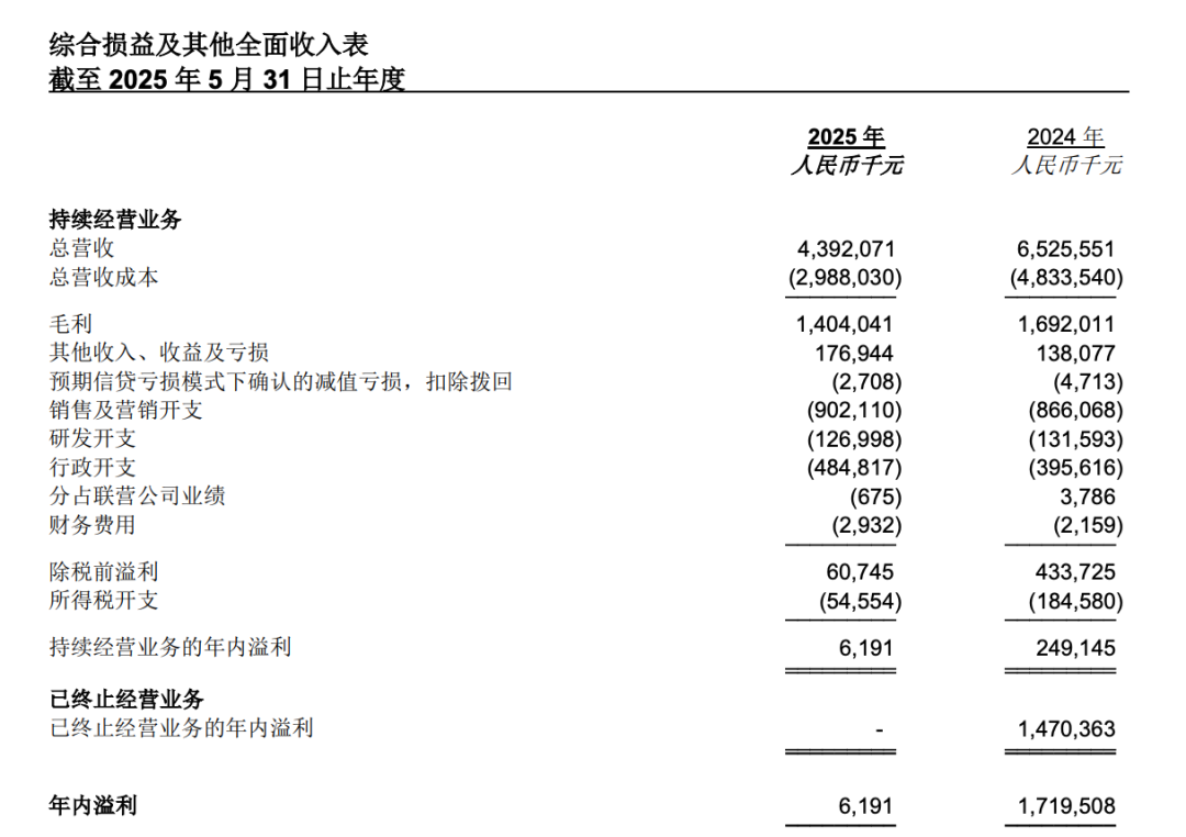 一边是直播电商流量红利见顶,另一边则是公司营收连续下滑。2025财年财报显示,东方甄选总营收44亿元,同比减少32.7%;持续经营业务净溢利620万元,较上年同期的2.49亿元大幅下降97.5%。全渠道已付GMV从143亿元降至87亿元,抖音渠道订单量由1.8亿单下滑至9160万单。