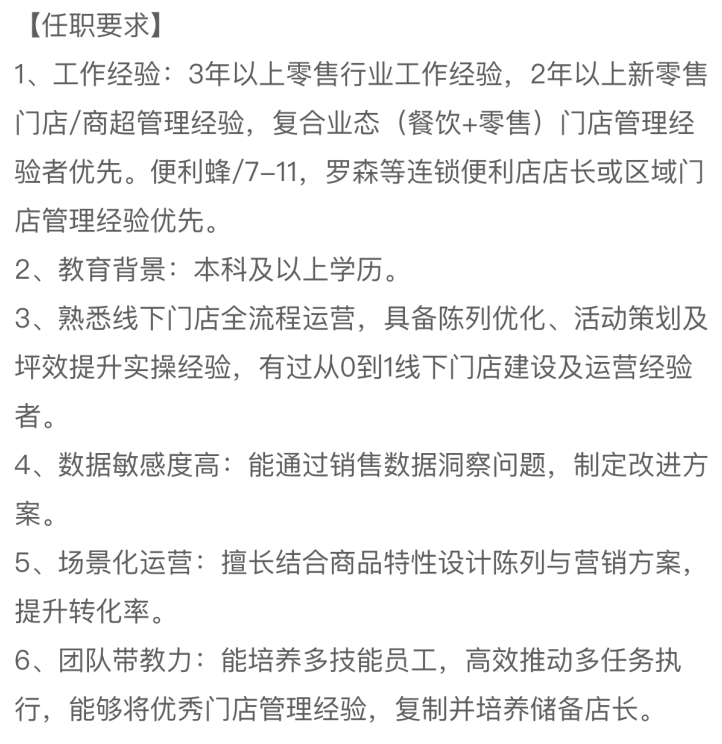 招聘启事显示,东方甄选对店长的要求尤为苛刻,不仅需要5年以上零售行业经验、3年以上新零售门店管理经验,还特别强调“餐饮+零售”复合业态管理背景,优先考虑便利蜂、7-ELEVEn、罗森等品牌的从业者。显然,东方甄选迫切希望借助成熟人才快速搭建运营体系,以弥补自身在线下运营经验上的短板。