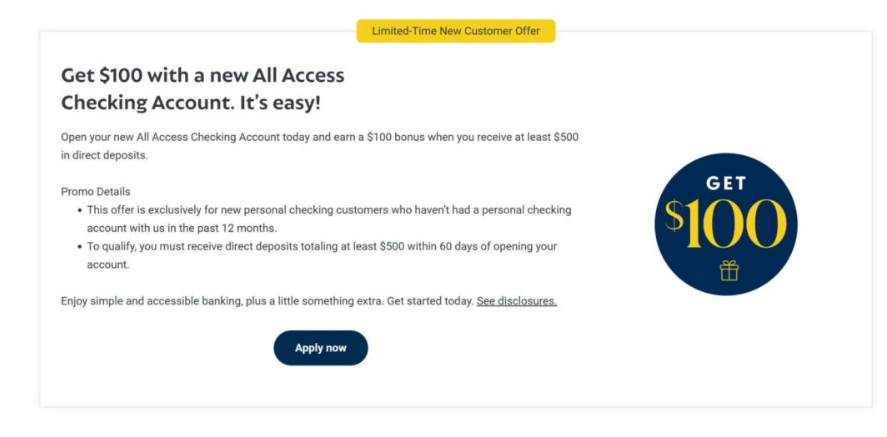 现在开设他家的 all access checking 账户,满足 60 天内 Direct Deposit 总额 $500,就可以获取 $100 的开户奖励。