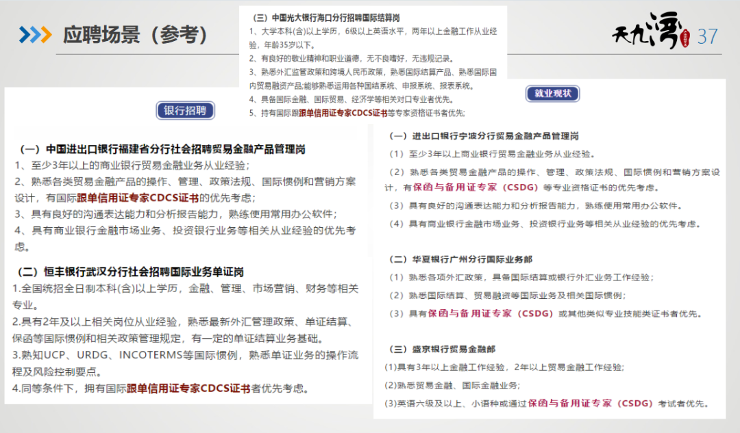 ● 商业银行国际业务部、结算部、单证部、贸金部、会计财务岗位、主管公司业务及信贷风险的行长、副行长;