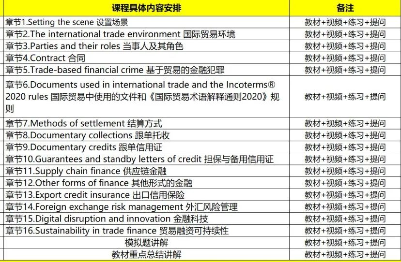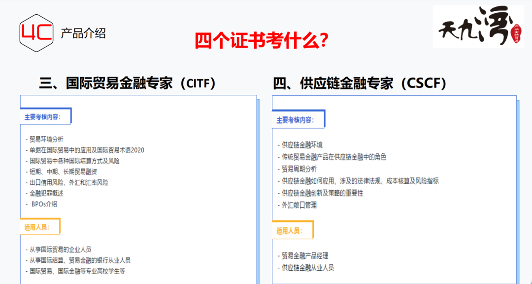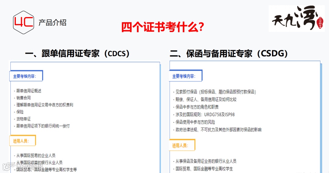 天九湾自常年常态化举办 CDCS、CSDG、CITF、CSCF线上考前辅导班,帮助考生快速提高知识水平和学习效率、把握贸易金融职场需具备专业知识,提高考试通过率。