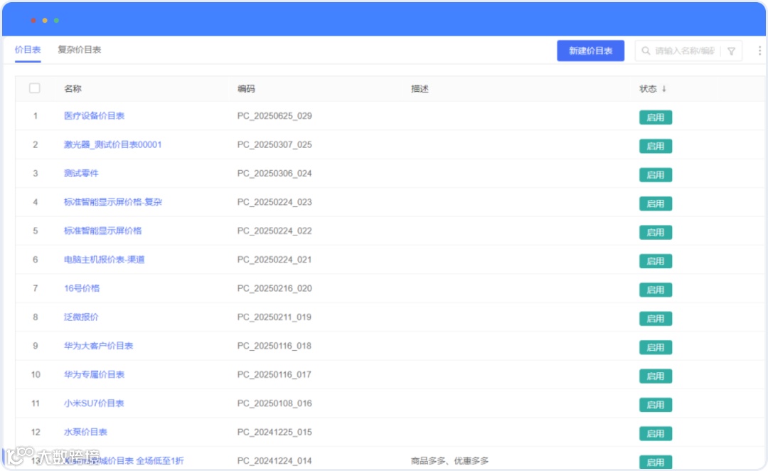 · 价目表价格:用户在报价过程中,不能手动调整价格,只能采用价目表价格进行报价。