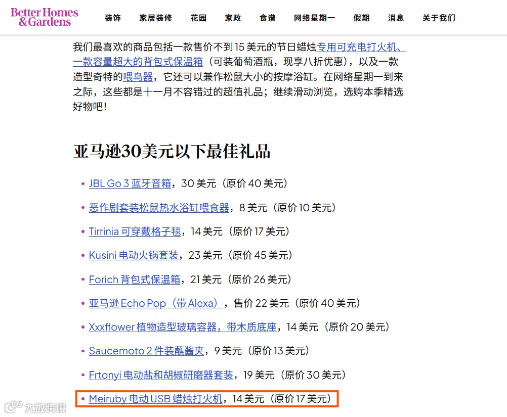 同时,品牌通过站外媒体推荐成功引流,助推销量增长。《纽约时报》在编辑精选专栏中力荐其电动打火机;月活超千万的顶尖家居博客 Better Homes & Gardens 将其列为“30美元以下最值得购买的圣诞礼物”;生活媒体 Real Simple 也将其纳入女性送礼指南。