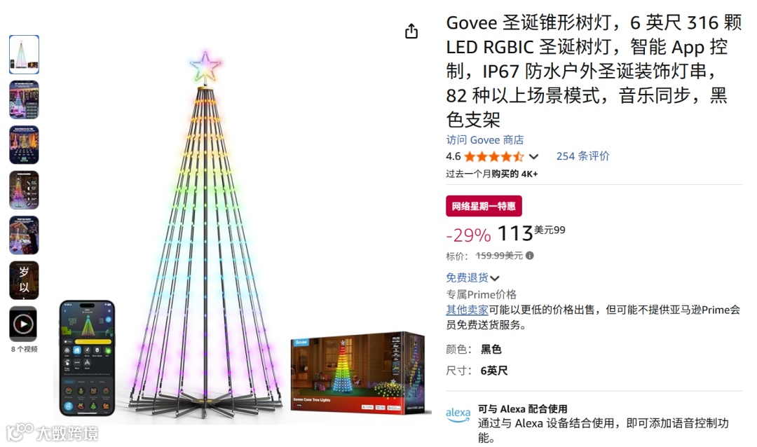 2024年,国产头部灯具品牌 Govee 推出圣诞主题锥形树灯,直至今年依旧保持畅销态势,月销突破4000件。
