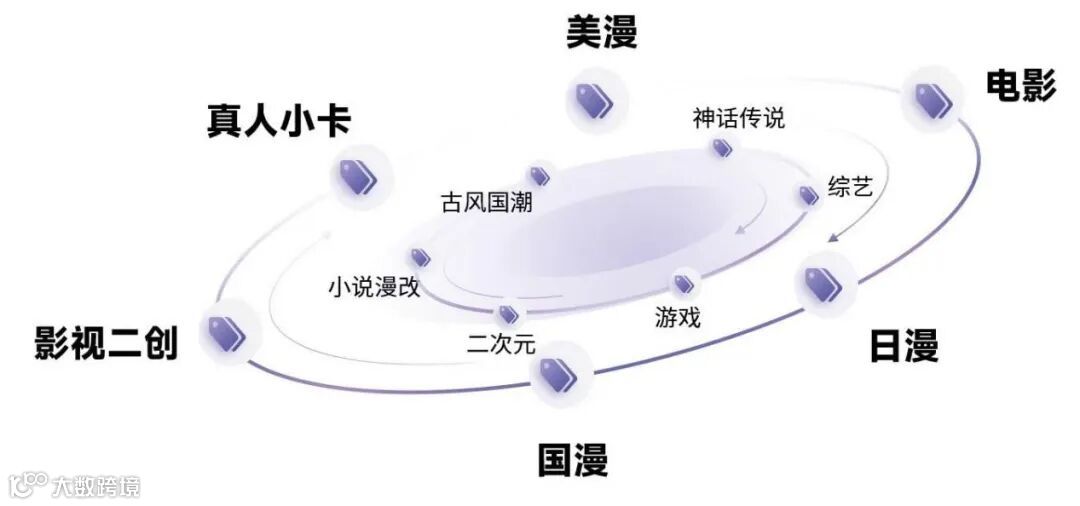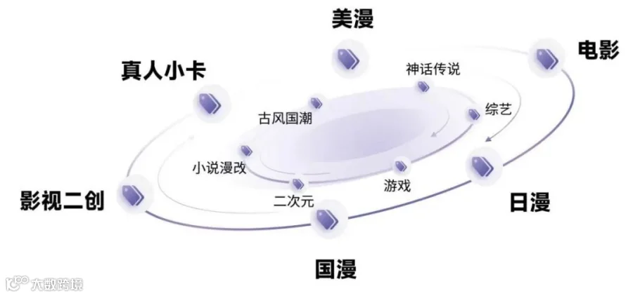 其次,这群人的兴趣爱好相对比较分散且丰富,适合我们的策略。我们不是走大爆款路线的,而是靠100个IP堆积起我们的收入,所以我们容易和IP做长期生意。
