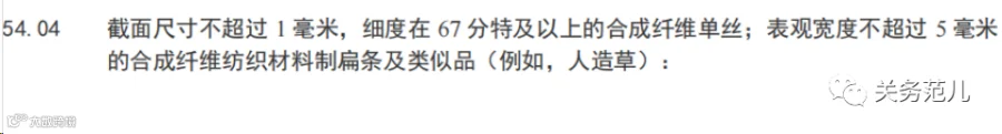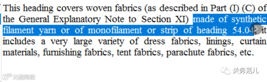 以品目54.07的注释为例,其中“用品目54.04的合成纤维长丝纱线、单丝或扁条纺制的机织物”的表述存在翻译瑕疵[k]。根据英文原文“woven fabrics made of synthetic filament yarn or of monofilament or strip of heading 54.04”,“of heading 54.04”仅修饰“monofilament or strip”(单丝或扁条),并不涵盖“synthetic filament yarn”(合成纤维长丝纱线)[k]。实际上,合成纤维长丝纱线应归入品目54.02,而非54.04[k]。