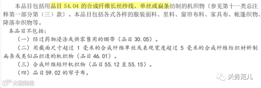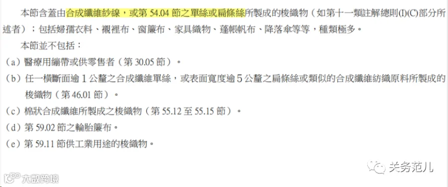 因此,现行中文注释的断句易引发误解,建议修订为“合成纤维长丝纱线、品目54.04的单丝或扁条”,以更准确反映原文结构与归类逻辑[k]。我国台湾地区税则注释的译文“由合成纤维纱线,或第54.04节之单丝或扁条丝所制成的梭织物”对此做出了更为合理的处理,可作为参考[k]。