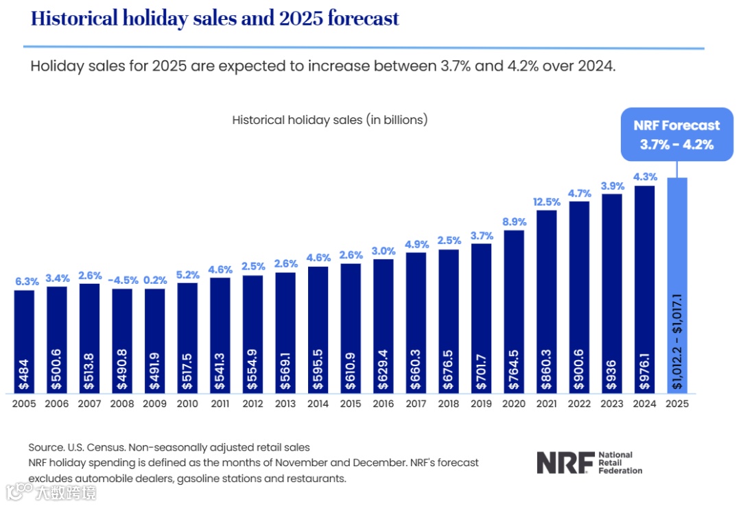 美国零售联合会(NRF)发布年度节日销售预测,预计2025年11月至12月零售额将同比增长3.7%至4.2%,总支出达1.01万亿至1.02万亿美元。相比之下,2024年假日季销售额为9761亿美元,同比增长4.3%。
