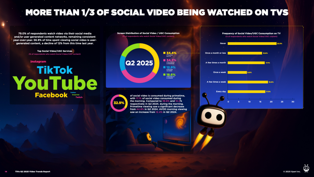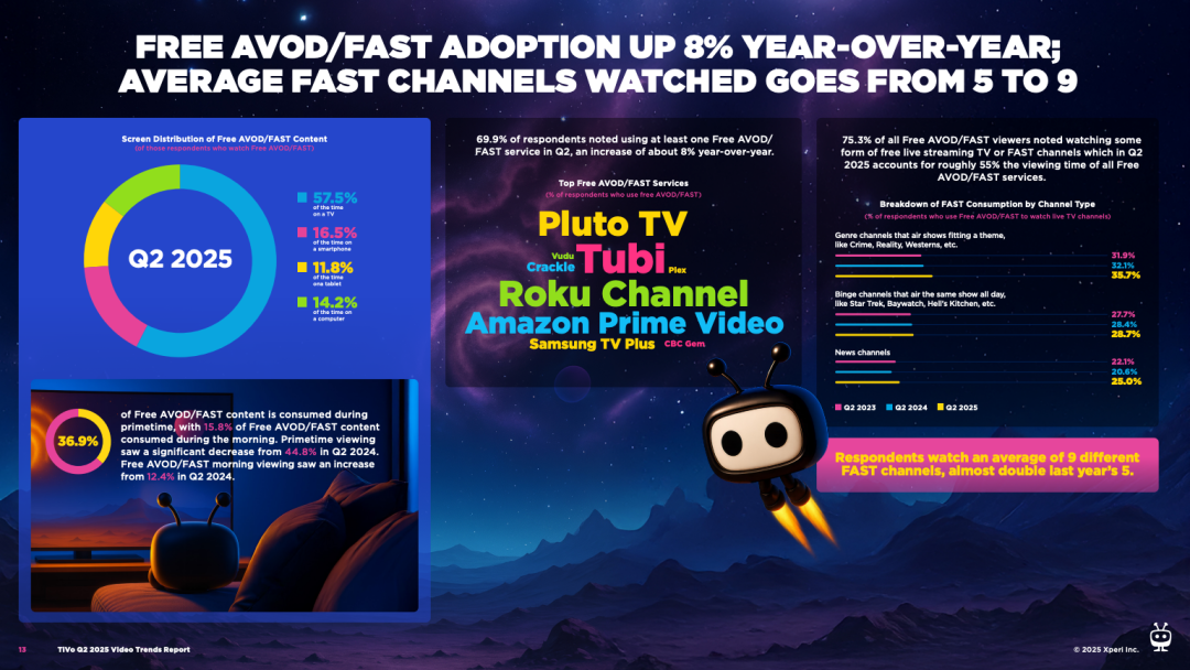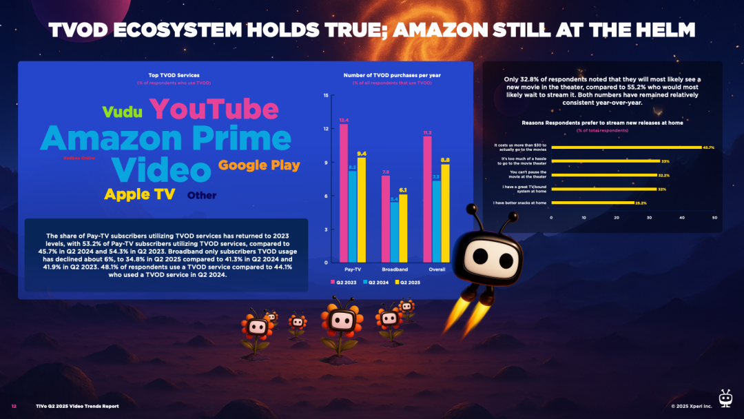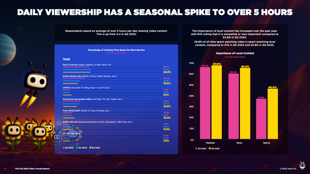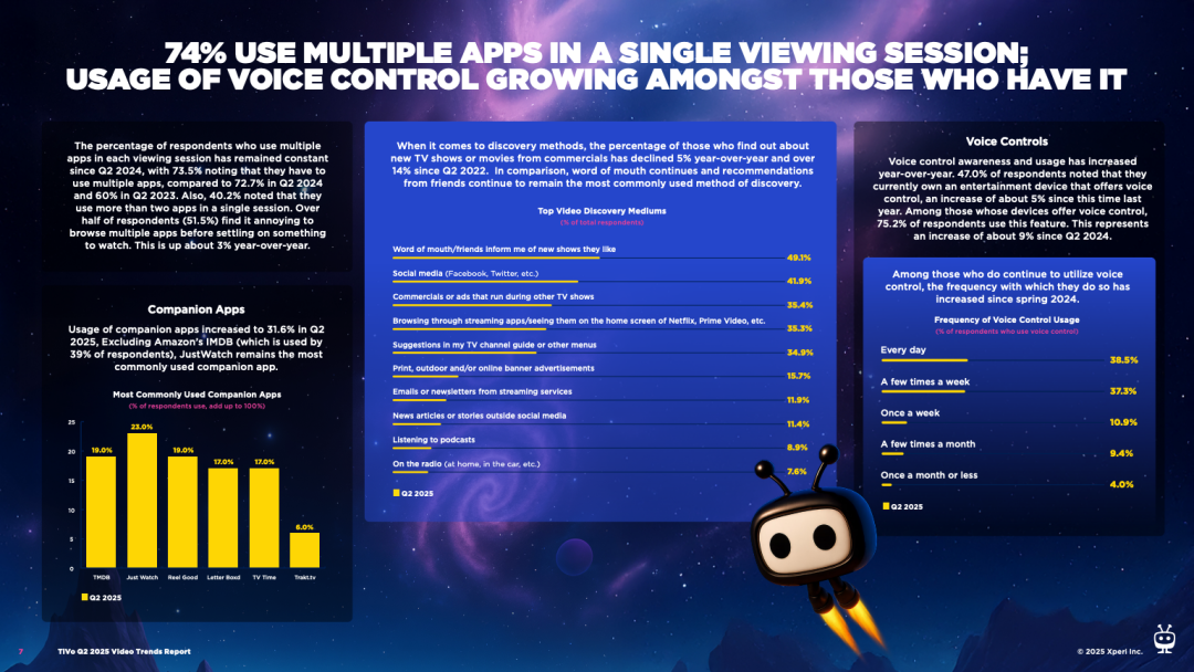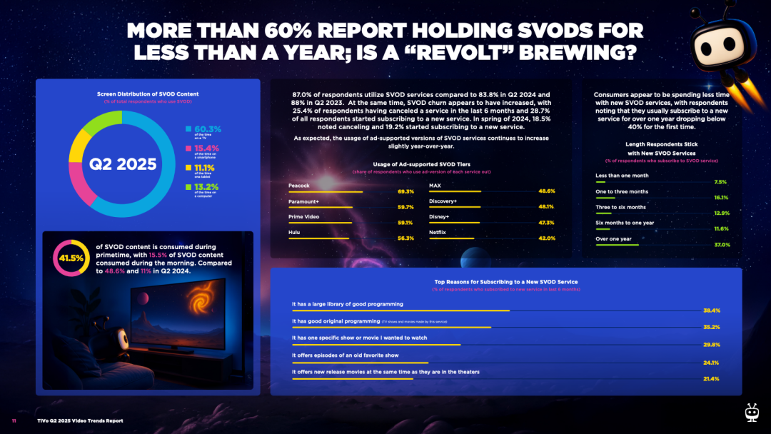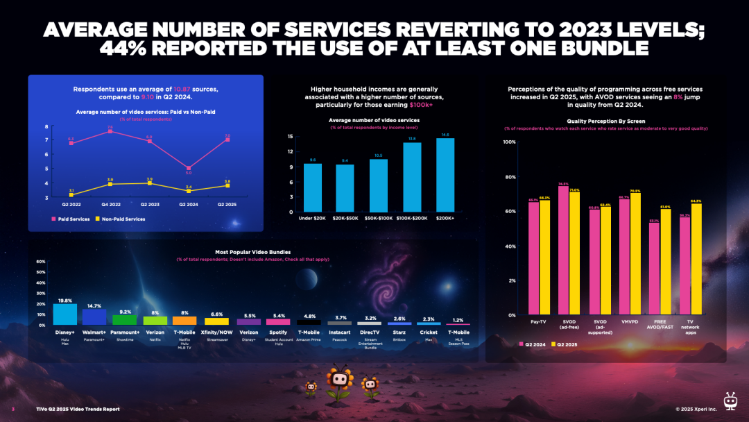这些发现方法似乎正在推动观众使用多种来源。这是因为今年第二季度使用的服务数量反弹至平均每位观众近11项(10.87)。这相较于2024年第二季度平均9.1项是一个巨大飞跃,并遏制了此前似乎出现的结构性下降。