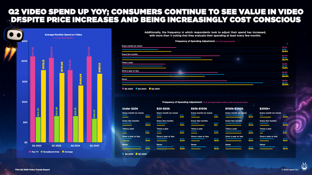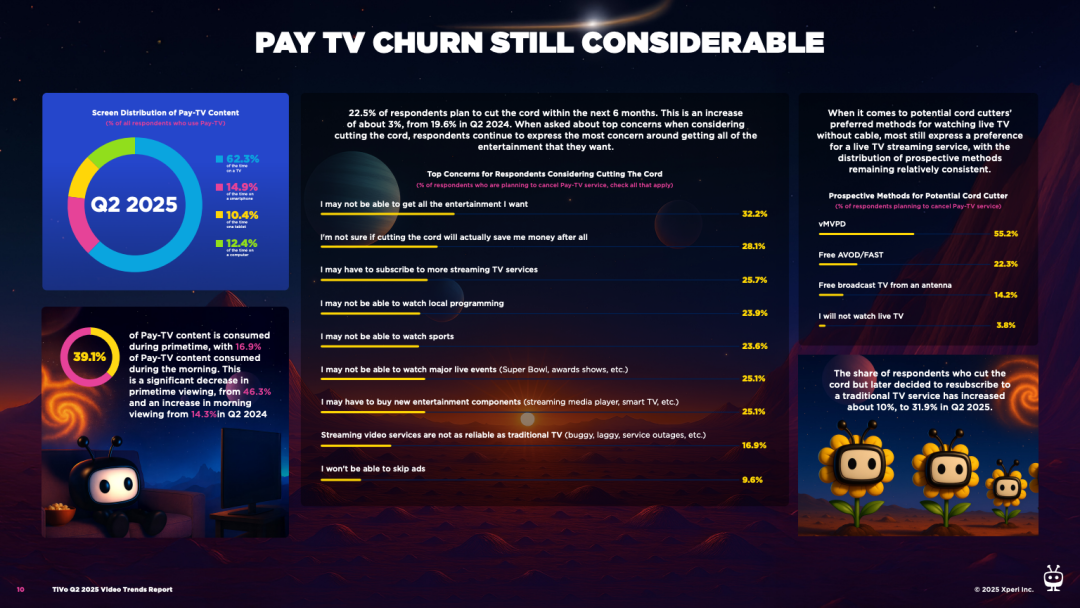 尽管质量感知在提升,但消费者仍在频繁评估他们的支出,超过1/3的人至少每几个月就会评估一次。根据该报告,付费电视的用户流失率仍然很高,并且SVOD的用户流失率也同比增长了。