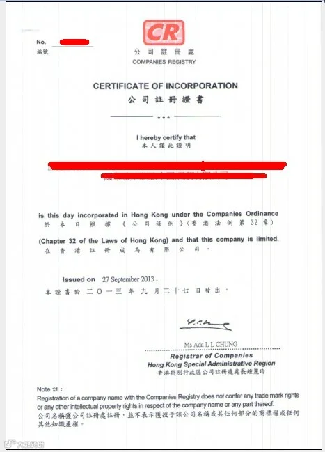 图 | 香港公司注册文件样本,象征合规运营基础