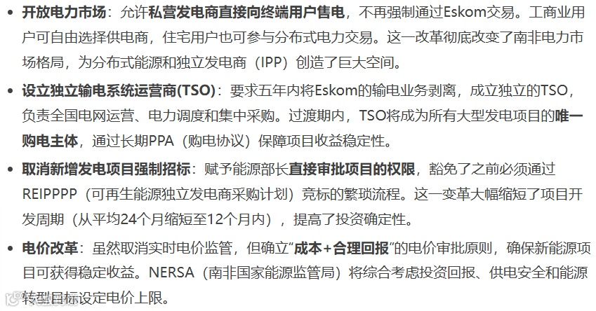 2025年1月生效的《修正案》是南非电力市场20年来最深刻的制度变革,旨在打破Eskom的垄断格局,引入市场化机制。法案的突破性改革包括: