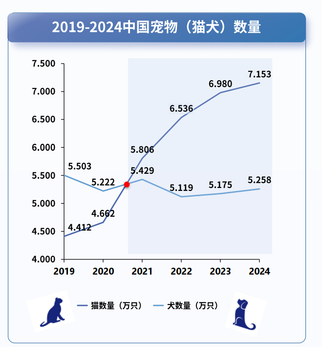 一方面,大城市对大型犬、烈性犬限制越来越严格,养狗成本(时间、空间、管理)变高;另一方面,猫更适合都市打工人:占地小、可独处、情绪价值高。于是,在政策、生活节奏、情感需求的共同作用下——猫的数量持续上升,“猫主粮”的盘子也水涨船高。