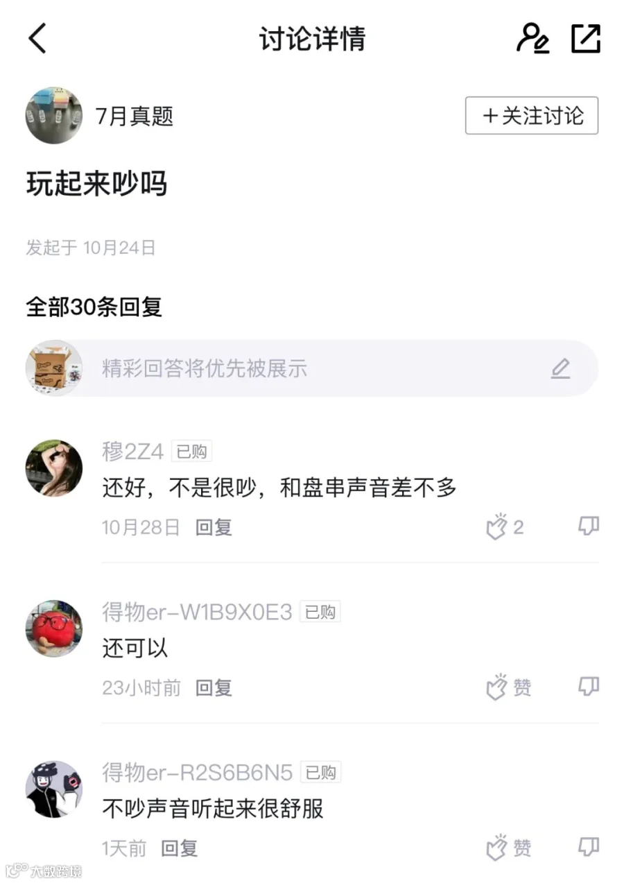 Tangle扭扭乐还有一个优点,它可以静音“盘”,不会影响到其他人。有人就在购买之前在得物社区提问过“玩起来吵吗?”得到的回答是“声音听起来很舒服。”