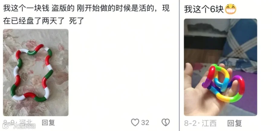 尽管Tangle目前还算是小众玩具,但市面上已经有了一些假冒伪劣产品钻空子。这些假货不但手感上差了不少,它们的使用材料更令人担心。毕竟是随时都会握在手里玩的玩具,一旦使用了劣质材料,可能会给身体健康带来风险。