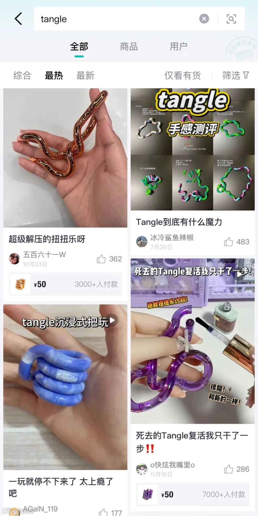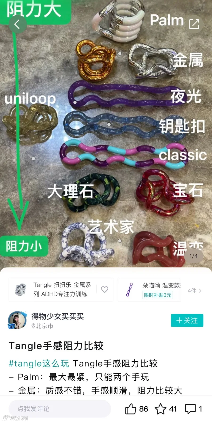 得物社区的玩家们,还会对自己如何选购有一些独到的心得与经验。一位收集了二十多个Tangle的得物用户表示:“不同材质、不同颜色、不同触感,每天去上班我会搭配心情拿不同系列的。”