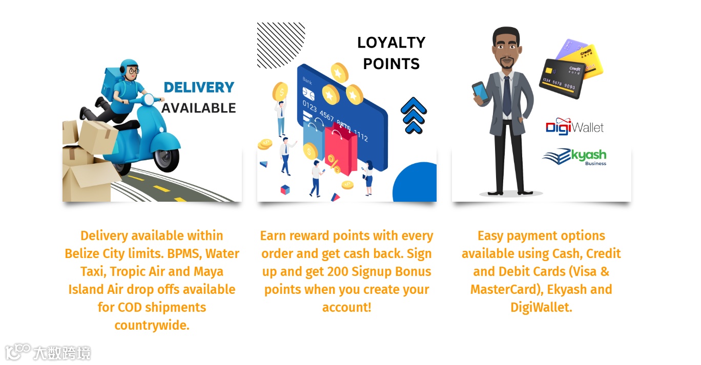 可在伯利兹市范围内送货。BPMS、Water Taxi、Tropic Air和Maya Island Air可在全国范围内进行COD运输。