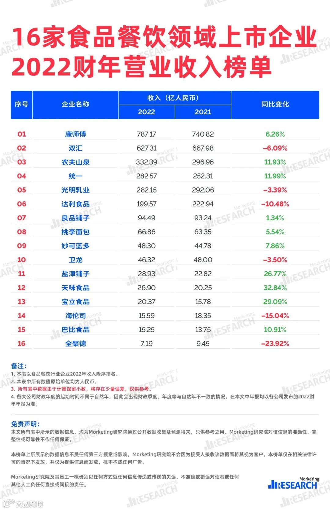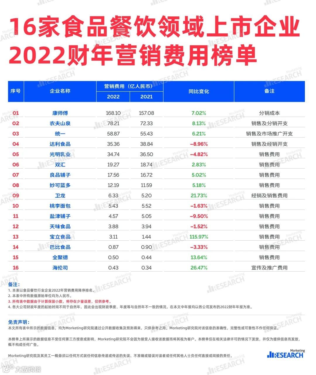 「Morketing研究院」通过对16家食品餐饮领域上市企业年报数据进行整理分析,汇总成2022财年收入与营销费用榜单。