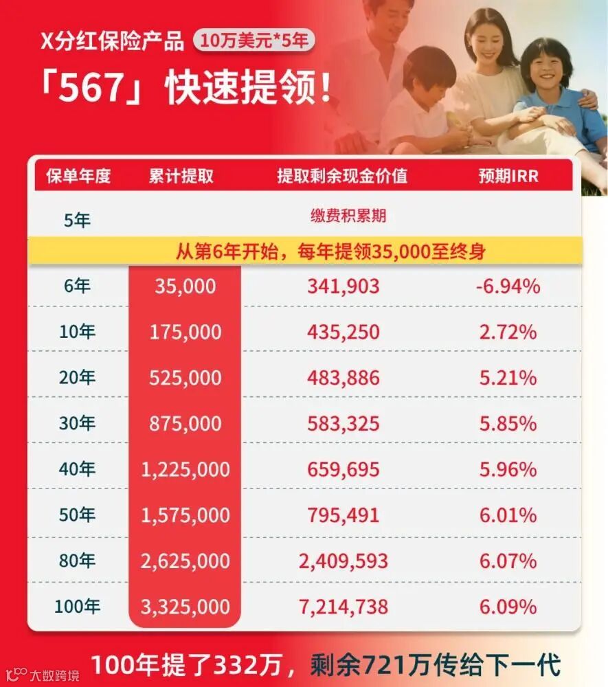 保费缴清次年即可提取,以总保费50万美元为例,预期年提取比例为7%,即3.5万美元,可持续终身。