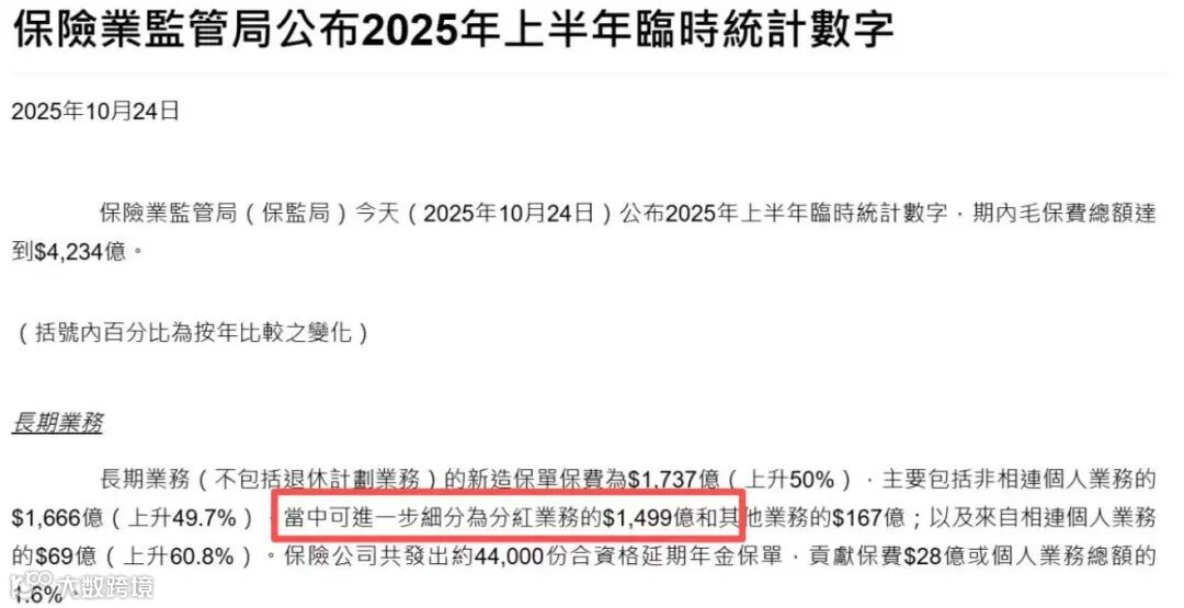 据香港保监局最新统计,2025年上半年全港新单总保费达1737亿港元,其中分红型业务保费收入1499亿港元,占比高达86%,凸显其绝对市场主导地位。