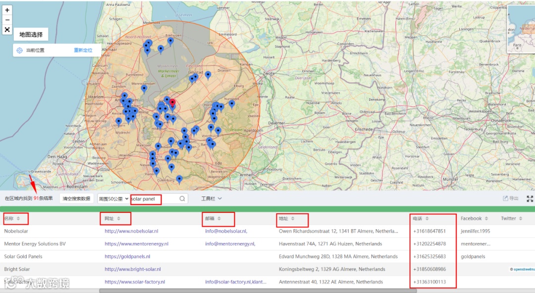 荷兰搜索“solar panel”:91家企业,73个有效号码,49个匹配WhatsApp,匹配率67%