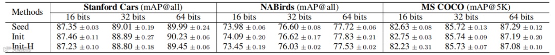 表3 初始化与更新算法随机性对 mAP 的影响(mean±std)。