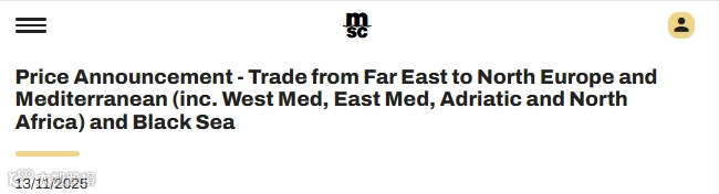 29日,地中海航运公司(MSC)宣布,自2025年12月15日起至另行通知为止(但不超过2025年12月31日),从所有远东港口(包括但不限于日本、韩国和东南亚的港口)到北欧、地中海(包括西地中海、东地中海、亚得里亚海和北非)以及黑海港口的运费将调整FAK费率如下: