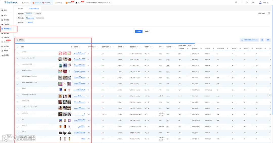 面对关键词选择难题,卖家可以使用Sorftime的【关键词看板】,就能解决选词精准度问题。通过数据筛选功能,快速找到搜索量适中、竞争度低的长尾关键词,避免与大卖家正面竞争。