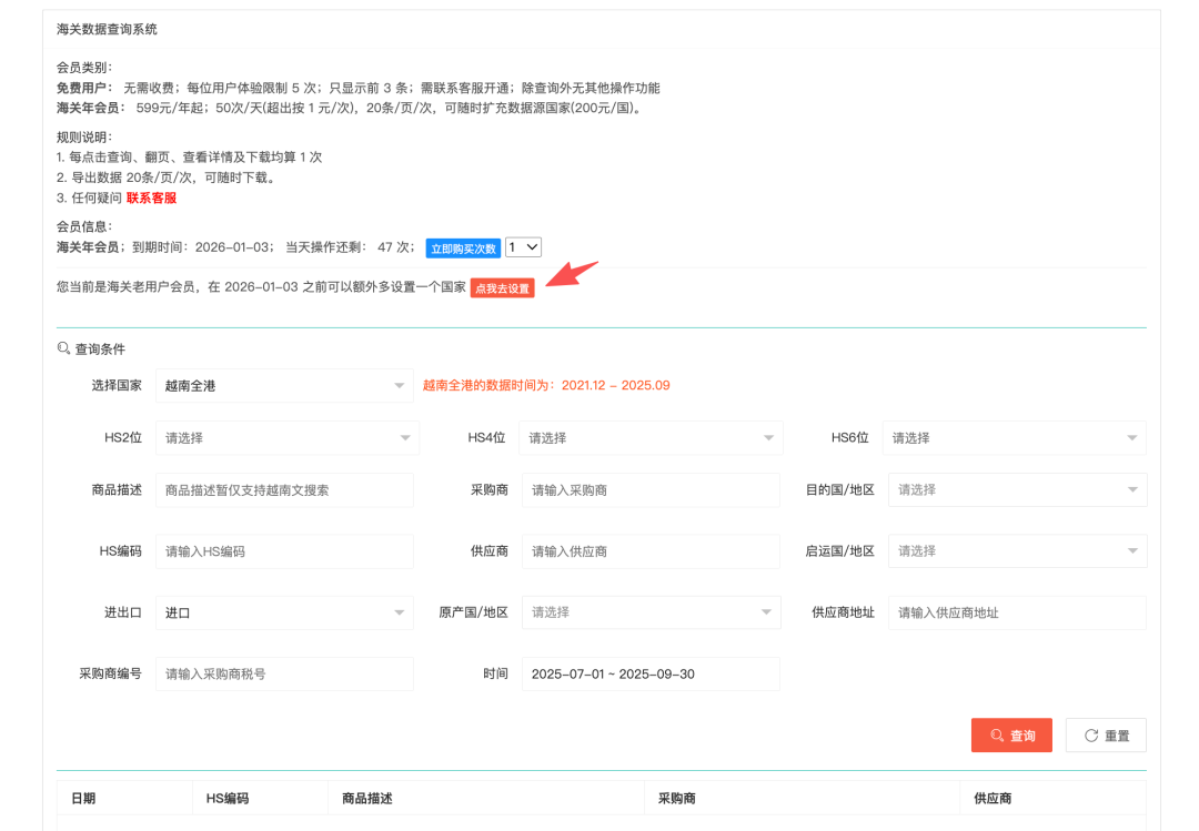 访问 vip会员 页面,点击 「海关会员」,勾选你所需的国家/地区(仅200元/个),支付后即可。