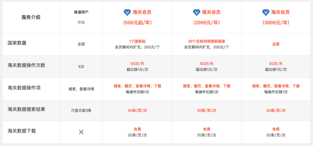 点击 vip会员 ,选择「海关会员」,会出现三类套餐,用户根据自己的需求购买即可,如下图:
