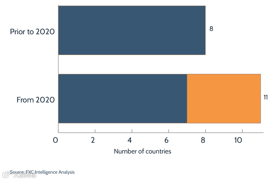 根据FXC Intelligence的研究,在2020年之前,有8个国家征收此类税,而这一数字已上升至11个,只有利比亚在去年取消了此类税。已经征收此类税的国家也相对普遍地提高了税率,比如阿根廷,该国在2020年9月将PAIS税从30%提高到35%。
