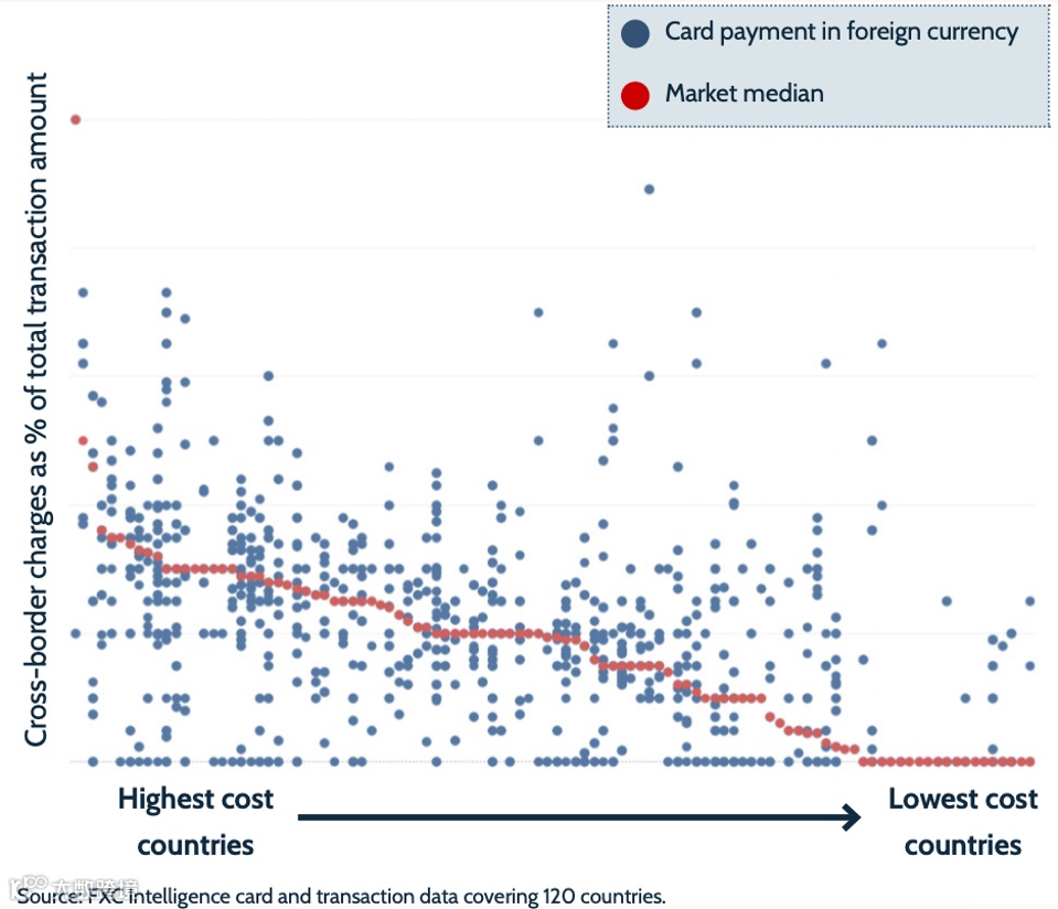 在一个例子中,我们使用FXC Intelligence的跨境交易数据,一位英国购物者从美国购买100美元的产品,如果用美元支付,总费用为5.71%,如果用英镑支付,则为5.36%。在第一种选择中,大部分费用由信用卡网络收取,但在第二种选择中,商家是获利的一方。