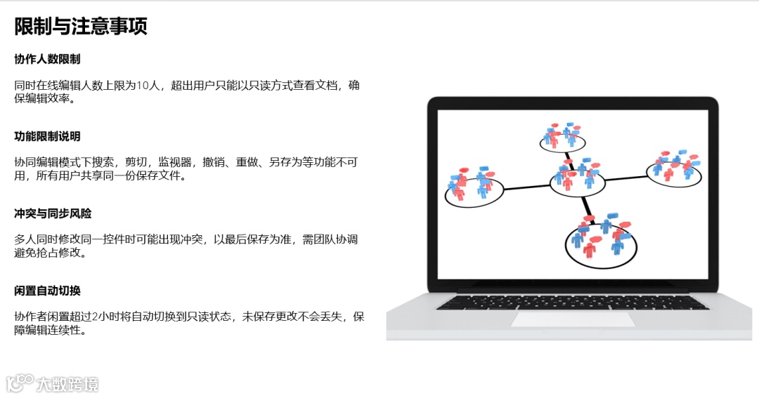 人数限制:同时在线协作编辑的人数,上限是 10 个人 。如果超过 10 个人,第 11 个人进来就只能是只读模式 。