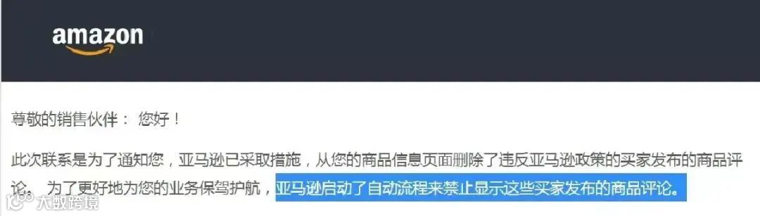 随后,卖家后台收到的亚马逊官方邮件称:“亚马逊已采取措施,从您的商品信息页面删除了违反亚马逊政策的买家发布的商品评论。为了更好地为您的业务保驾护航,亚马逊启动了自动流程来禁止显示这些买家发布的商品评论。”