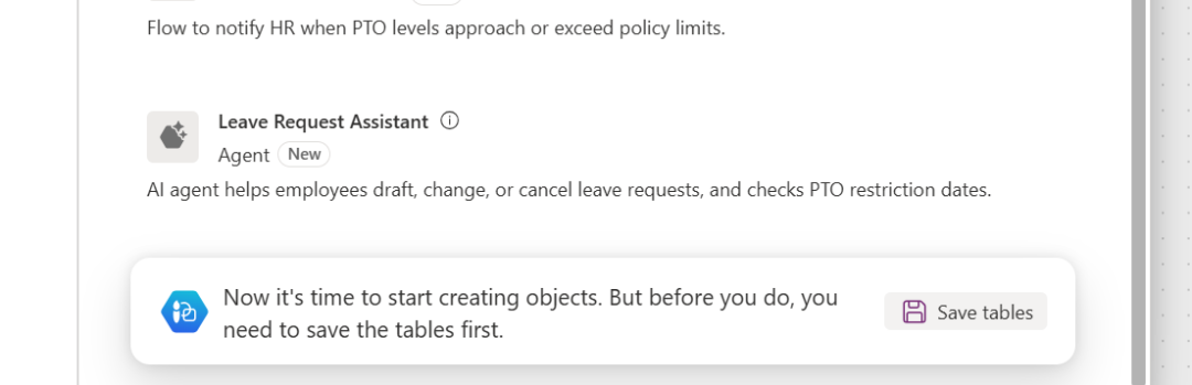 - 点击右下角的 “Save tables”。他会先把设计好的Dataverse 表保存好。