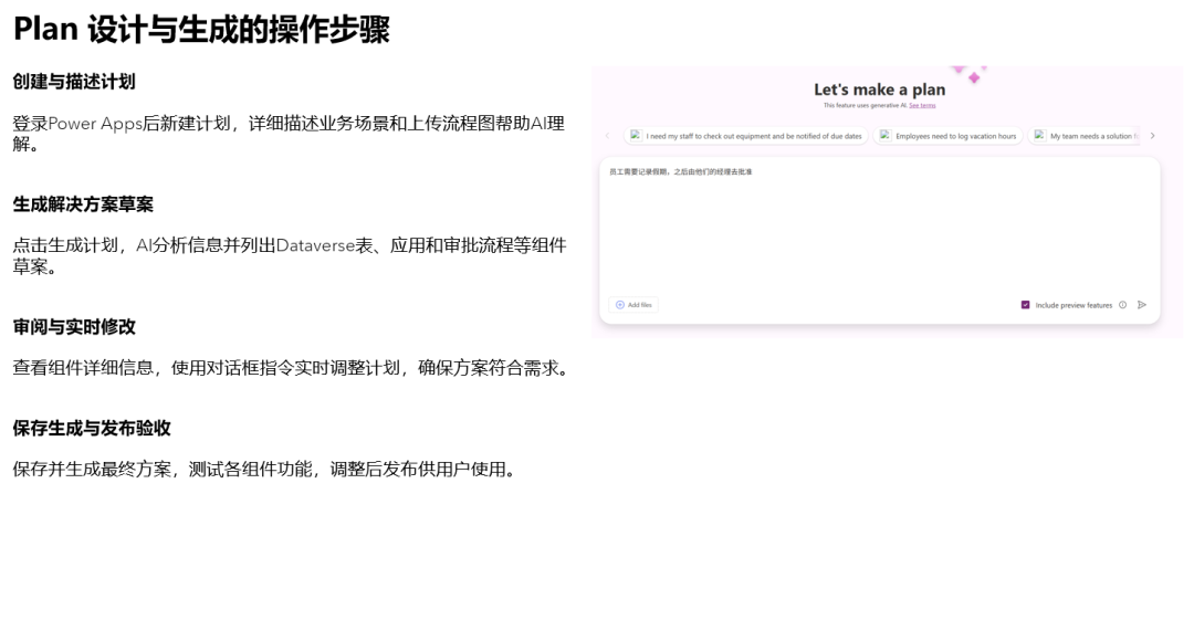 大家一定要理解 "Plan" 的定位。如果说我们后面要讲的 Copilot 是帮我们建一个“应用”,那 Plan 就是帮我们建一整套“业务解决方案”。